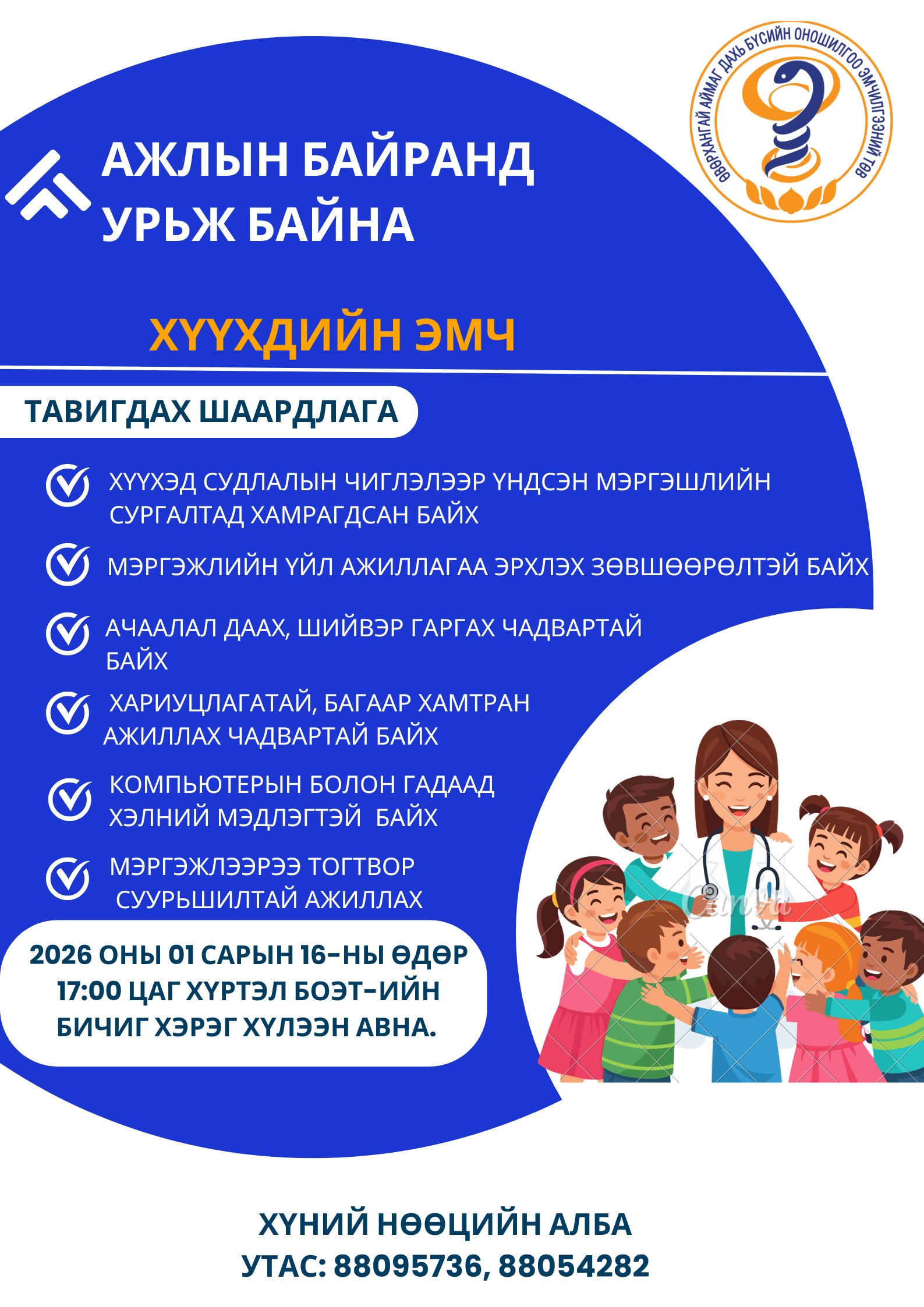 ХҮҮХДИЙН ЭМЧИЙН АЖЛЫН БАЙРАНД УРЬЖ БАЙНА.