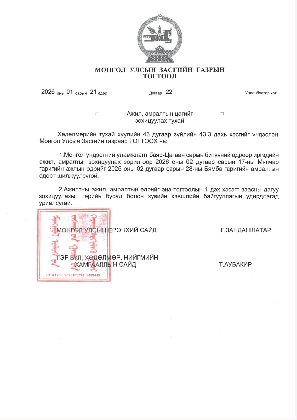Засгийн газрын 2026 оны 22 дугаар тогтоолын дагуу 2026 оны 02 дугаар сарын 28-ны өдөр буюу ирэх Бямба гарагт ажиллана.